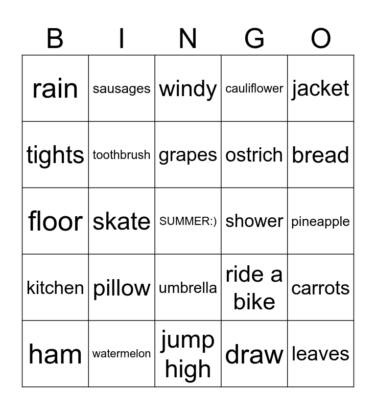 This bingo card has a free space and 24 words: pillow, watermelon, grapes, ham, jacket, rain, tights, sausages, shower, umbrella, ostrich, floor, ride a bike, carrots, toothbrush, draw, pineapple, windy, bread, skate, leaves, kitchen, cauliflower and jump high.