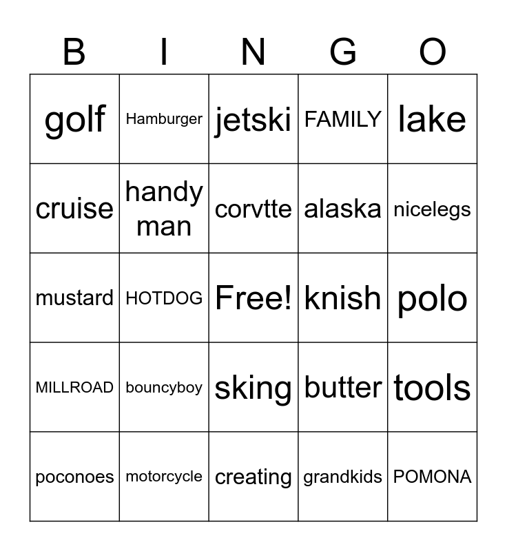 This bingo card has a free space and 24 words: bouncyboy, motorcycle, corvtte, poconoes, lake, golf, cruise, Hamburger, knish, sking, alaska, mustard, butter, tools, handy man, grandkids, polo, jetski, nicelegs, HOTDOG, POMONA, MILLROAD, FAMILY and creating.