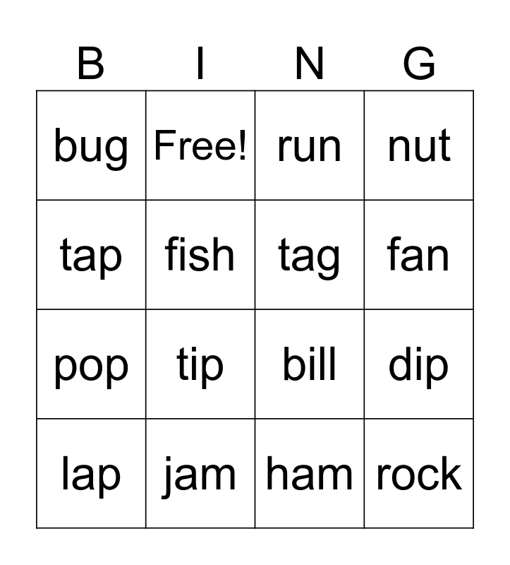 This bingo card has 16 words: jam, dip, run, bug, pop, Free!, bill, ham, tap, fish, lap, nut, tip, fan, tag and rock.