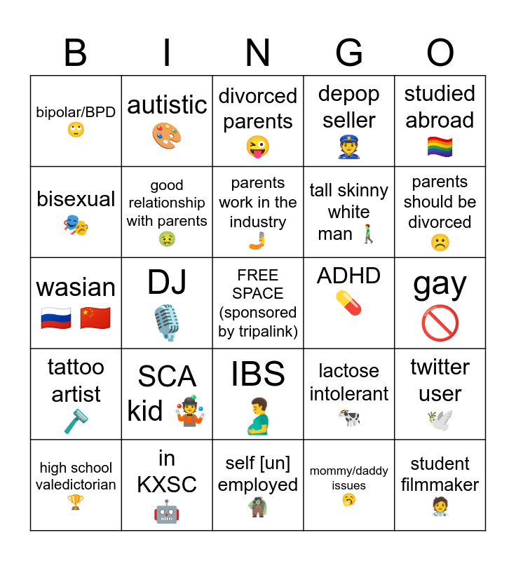 This bingo card has a free space and 24 words: SCA kid ๐คน, in KXSC ๐ค, parents work in the industry ๐คณ, high school valedictorian ๐, studied abroad ๐ณ๏ธโ๐, bipolar/BPD ๐, bisexual ๐ญ, autistic ๐จ, ADHD ๐, IBS ๐ซ, tall skinny white man ๐ถโโ๏ธ, wasian ๐ท๐บ ๐จ๐ณ, lactose intolerant ๐, twitter user ๐๏ธ, good relationship with parents ๐คข, mommy/daddy issues ๐ฅฑ, gay ๐ซ, divorced parents ๐, parents should be divorced โน๏ธ, DJ ๐๏ธ, student filmmaker ๐งโโ๏ธ, tattoo artist ๐ช, depop seller ๐ฎ and self [un] employed ๐ง.