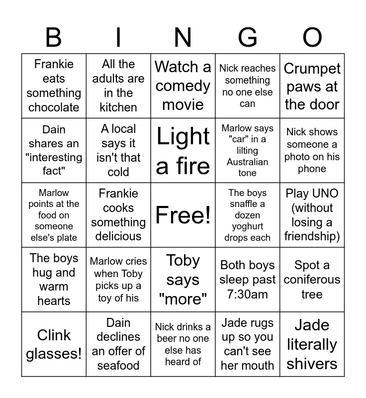 This bingo card has a free space and 25 words: Marlow cries when Toby picks up a toy of his, Nick drinks a beer no one else has heard of, Light a fire, Clink glasses!, Crumpet paws at the door, Frankie eats something chocolate, Dain shares an "interesting fact", All the adults are in the kitchen, The boys snaffle a dozen yoghurt drops each, Toby says "more", Marlow says "car" in a lilting Australian tone, Marlow points at the food on someone else's plate, Both boys sleep past 7:30am, Spot a coniferous tree, A local says it isn't that cold, Someone wears a scarf, Play UNO (without losing a friendship), Watch a comedy movie, Nick shows someone a photo on his phone, Frankie cooks something delicious, Jade literally shivers, Dain declines an offer of seafood, The boys hug and warm hearts, Nick reaches something no one else can and Jade rugs up so you can't see her mouth.