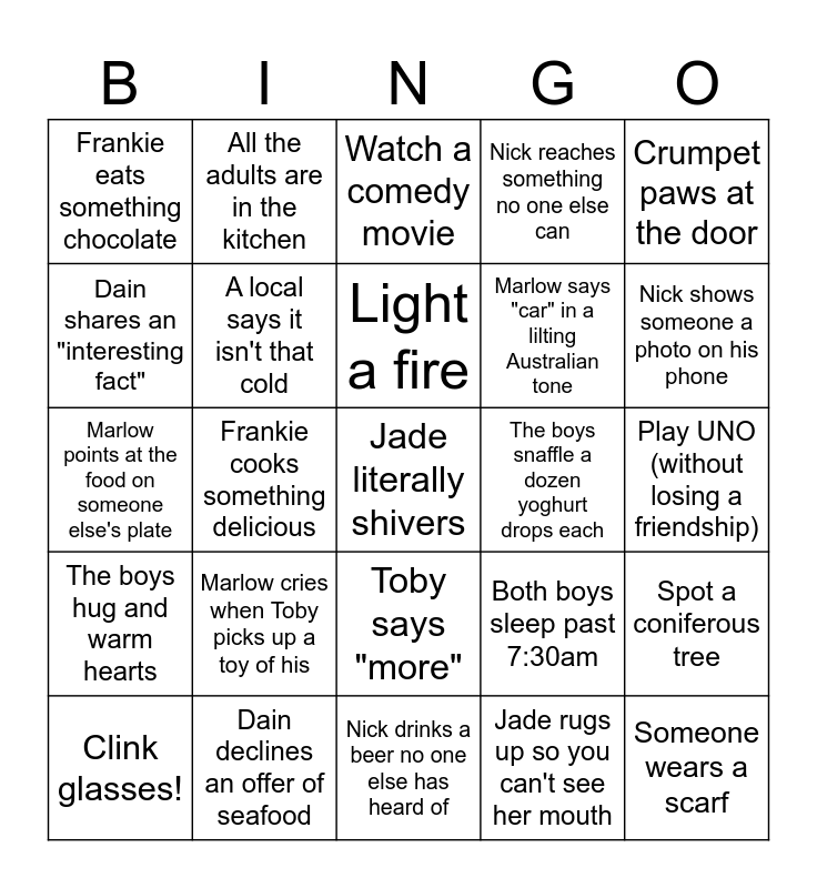 This bingo card has 25 words: Marlow cries when Toby picks up a toy of his, Nick drinks a beer no one else has heard of, Light a fire, Clink glasses!, Crumpet paws at the door, Frankie eats something chocolate, Dain shares an "interesting fact", All the adults are in the kitchen, The boys snaffle a dozen yoghurt drops each, Toby says "more", Marlow says "car" in a lilting Australian tone, Marlow points at the food on someone else's plate, Both boys sleep past 7:30am, Spot a coniferous tree, A local says it isn't that cold, Someone wears a scarf, Play UNO (without losing a friendship), Watch a comedy movie, Nick shows someone a photo on his phone, Frankie cooks something delicious, Jade literally shivers, Dain declines an offer of seafood, The boys hug and warm hearts, Nick reaches something no one else can and Jade rugs up so you can't see her mouth.