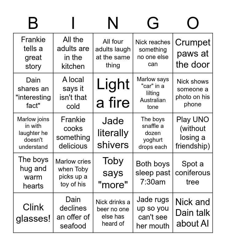 This bingo card has 25 words: Marlow cries when Toby picks up a toy of his, Nick drinks a beer no one else has heard of, Light a fire, Clink glasses!, Crumpet paws at the door, Frankie tells a great story, Dain shares an "interesting fact", All the adults are in the kitchen, The boys snaffle a dozen yoghurt drops each, Toby says "more", Marlow says "car" in a lilting Australian tone, Marlow joins in with laughter he doesn't understand, Both boys sleep past 7:30am, Spot a coniferous tree, A local says it isn't that cold, Nick and Dain talk about AI, Play UNO (without losing a friendship), All four adults laugh at the same thing, Nick shows someone a photo on his phone, Frankie cooks something delicious, Jade literally shivers, Dain declines an offer of seafood, The boys hug and warm hearts, Nick reaches something no one else can and Jade rugs up so you can't see her mouth.