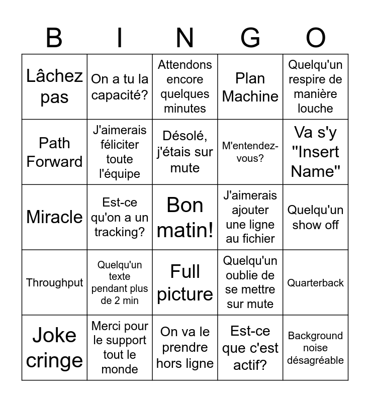 This bingo card has a free space and 36 words: Quelqu'un parle au cell à son tour, Est-ce que c'est déjà au tableau?, Ca fait 1 semaine que je suis arrêté, J'aimerais féliciter toute l'équipe, Quelqu'un oublie de se mettre sur mute, Throughput, Désolé, j'étais sur mute, Enlève ca du fichier, Quelqu'un respire de manière louche, Un micro inaudible, Est-ce qu'on a un tracking?, Plan Machine, Un ACA se fait challenger, J'aimerais ajouter une ligne au fichier, Va s'y ''Insert Name'', Lâchez pas, J'ai de la misère avec le fichier, Quelqu'un texte pendant plus de 2 min, Background noise désagréable, Attendons encore quelques minutes, Quelqu'un show off, Quarterback, Merci pour le support tout le monde, Joke cringe, On va le prendre hors ligne, On a tu la capacité?, Miracle, Commentaire sur la température, M'entendez-vous?, Path Forward, Quelqu'un utilise un emoji dans le chat, C'est quoi le story?, Est-ce que c'est actif?, Full picture, Faut absolument que ca sorte and Quelqu'un Tousse.