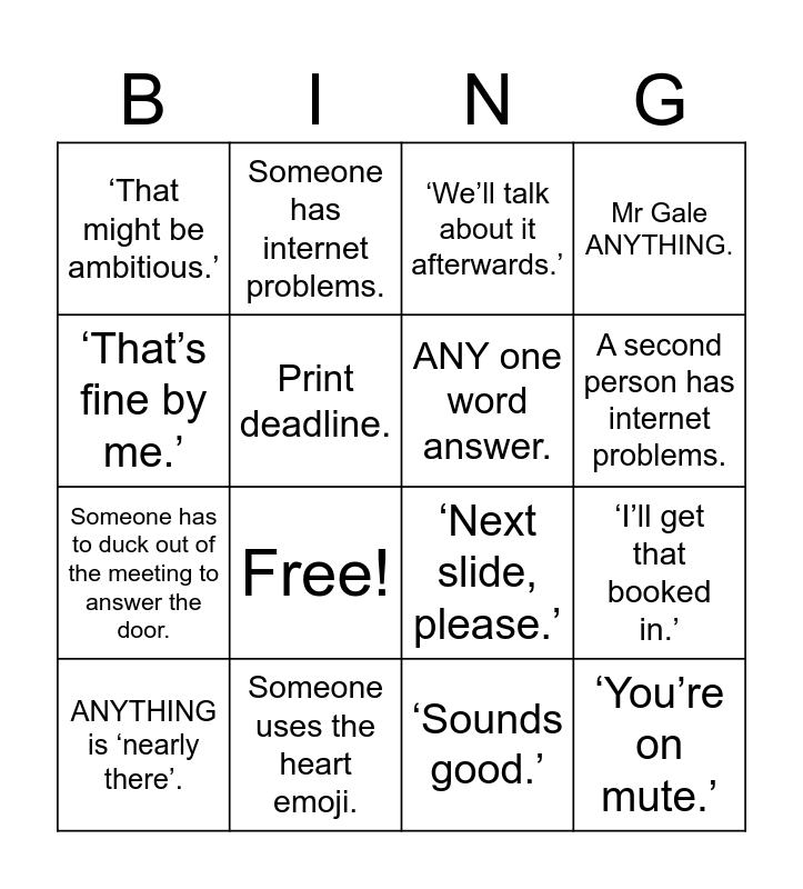 This bingo card has 18 words: Free!, ‘You’re on mute.’, ‘We’ll talk about it afterwards.’, ‘That might be ambitious.’, ‘Next slide, please.’, Mr Gale ANYTHING., ANYTHING is ‘nearly there’., Someone has internet problems., A second person has internet problems., Someone has to duck out of the meeting to answer the door., ‘Sounds good.’, ‘That’s fine by me.’, ‘I’ll get that booked in.’, Print deadline., ANY one word answer., Someone uses the exploding confetti emoji., Someone uses the heart emoji. and Can everyone see my screen?.