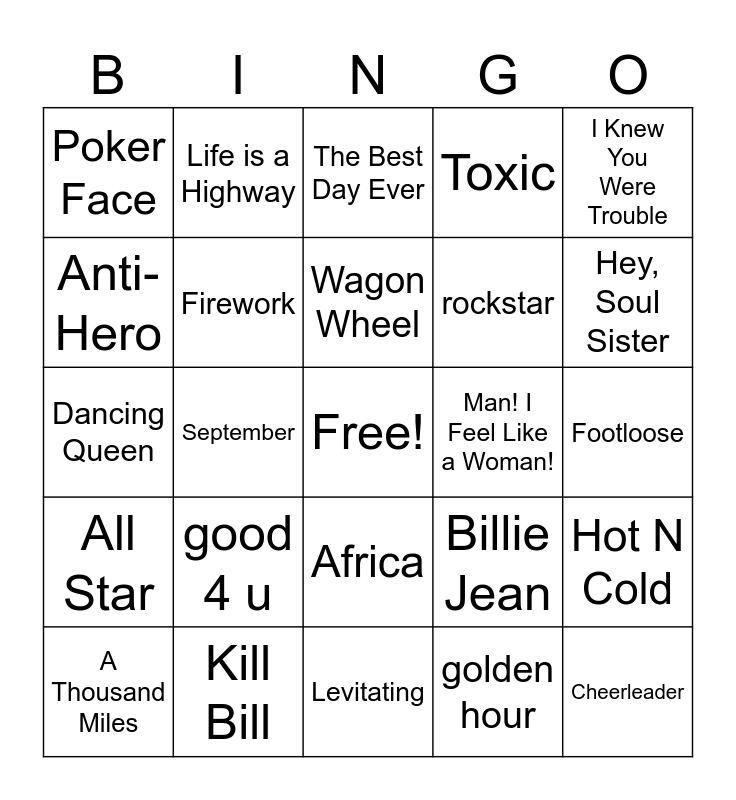 This bingo card has a free space and 30 words: Kill Bill, Daylight, September, Dumb Love, Poker Face, The Best Day Ever, Firework, Africa, Man! I Feel Like a Woman!, Levitating, Footloose, Cheerleader, golden hour, Olivia, Hey, Soul Sister, Hey Ya!, Billie Jean, All Star, good 4 u, I Knew You Were Trouble, Dancing Queen, Love is an Open Door, Life is a Highway, rockstar, Anti-Hero, Toxic, Hot N Cold, A Thousand Miles, Wagon Wheel and Im Good(Blue).