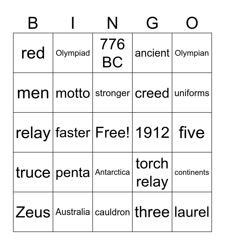 This bingo card has a free space and 25 words: penta, cauldron, stronger, Zeus, Olympian, red, men, Olympiad, 1912, Antarctica, creed, relay, torch relay, continents, motto, Olympia, five, 776 BC, uniforms, faster, laurel, Australia, truce, ancient and three.