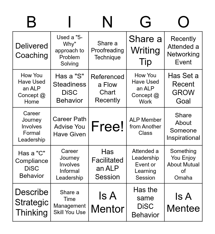 This bingo card has a free space and 34 words: Used a Fishbone Technique (on what), Has the same DiSC Behavior, Has a "D" Dominance DiSC Behavior, Has an "I" Influence DiSC Behavior, Has a "C" Compliance DiSC Behavior, Has a "S" Steadiness DiSC Behavior, Recently Attended a Networking Event, Describe Strategic Thinking, Used a "5-Why" approach to Problem Solving, Used Mind Mapping, Referenced a Flow Chart Recently, Share a Proofreading Technique, Held 3+ Roles in Mutual of Omaha, Member of an ERG, ALP Member from Another Class, Has Set a Recent GROW Goal, Share a Time Management Skill You Use, Career Journey Involves Formal Leadership, Career Journey Involves Informal Leadership, Attended a Leadership Event or Learning Session, Has Facilitated an ALP Session, Received Coaching, Delivered Coaching, Share About Someone Inspirational, Is A Mentor, Is A Mentee, Share a Writing Tip, Share a Verbal Communication Tip, How You Have Used an ALP Concept @ Work, How You Have Used an ALP Concept @ Home, Career Path Advise You Have Received, Career Path Advise You Have Given, Something You Enjoy About Mutual of Omaha and Something You Have Learned While at Mutual of Omaha.