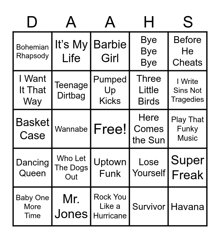 This bingo card has a free space and 89 words: Man! I Feel Like a Woman!, Billie Jean, Uptown Funk, Sweet Caroline, Wonderwall, Despacito, Ain’t No Mountain High Enough, 99 Luftballons, Crazy Train, In Da Club, Push It, U Can’t Touch This, Super Freak, Play That Funky Music, Never Gonna Give You Up, Pumped Up Kicks, Piano Man, The Sound of Silence, Little Talks, Sweet Dreams, Fortunate Son, Kryptonite, Rock You Like a Hurricane, The Final Countdown, Basket Case, Mr. Jones, Closing Time, Hallelujah, Rock the Casbah, We’re Not Gonna Take It, Bye Bye Bye, Wannabe, All I Want for Christmas is You, Bohemian Rhapsody, Livin’ on a Prayer, Barbie Girl, I Want It That Way, Single Ladies, I Write Sins Not Tragedies, Baby One More Time, Dancing Queen, Hello, Stacy’s Mom, I’ll Make Love to You, Lose Yourself, Here Comes the Sun, I Gotta Feeling, Umbrella, Girls Like You, It’s My Life, Hot in Herre, California Gurls, Paint It, Black, Baba O’Riley, What’s Up?, Smells Like Teen Spirit, Rolling in the Deep, Shape of You, Chandelier, Bad Romance, I Wanna Dance with Somebody (Who Loves Me), Space Oddity, Roar, Hotel California, Hallelujah, Zombie, Call Me Maybe, We Will Rock You, Hey Jude, Who Let The Dogs Out, Havana, American Pie, We Belong Together, Three Little Birds, Teenage Dirtbag, Survivor, The Real Slim Shady, In The Air Tonight, Sweet Home Alabama, Jolene, Before He Cheats, Low, Stayin’ Alive, Born to Be Wild, Thriller, Mr. Brightside, I Can’t Get No (Satisfaction), Hey Ya! and My Way.