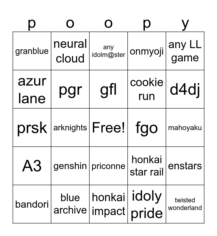 This bingo card has a free space and 24 words: genshin, blue archive, gfl, bandori, any LL game, granblue, azur lane, neural cloud, fgo, priconne, cookie run, prsk, honkai star rail, enstars, pgr, idoly pride, mahoyaku, any idolm@ster, d4dj, arknights, twisted wonderland, A3, onmyoji and honkai impact.
