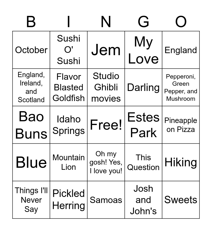 This bingo card has a free space and 32 words: Josh and John's, Daniel's Fountain House, Idaho Springs, Green, Blue, Flavor Blasted Goldfish, England, Hiking, Sushi O' Sushi, Princess Mononoke, Studio Ghibli movies, Jem, Floof, St. Mary's Glacier, Estes Park, Osmanthus Oolong, Things I'll Never Say, Bao Buns, Oh my gosh! Yes, I love you!, Mountain Lion, This Question, Sushi, Pineapple on Pizza, Pickled Herring, Sweets, My Love, Darling, England, Ireland, and Scotland, October, Samoas, The Good Place and Pepperoni, Green Pepper, and Mushroom.