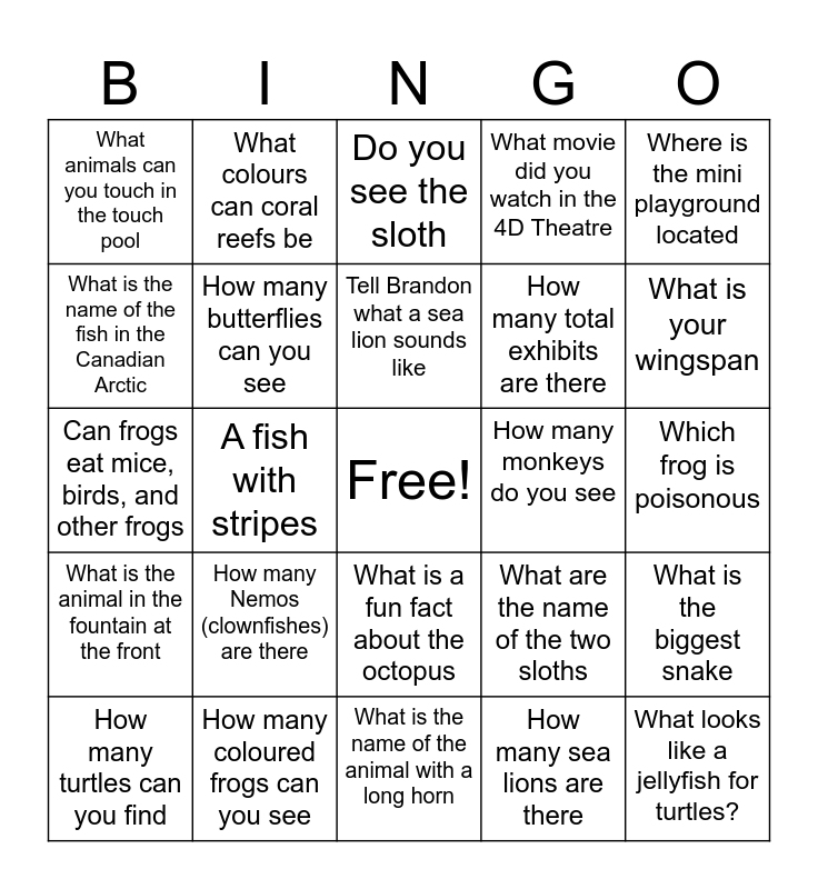 This bingo card has a free space and 29 words: How many turtles can you find, What is the sea otter's name, A fish with stripes, Name a type of shark, What animals can you touch in the touch pool, Do you see the sloth, How many butterflies can you see, How many Nemos (clownfishes) are there, How many monkeys do you see, How many coloured frogs can you see, Which frog is poisonous, What looks like a jellyfish for turtles?, What is the name of the animal with a long horn, How many sea lions are there, What is your wingspan, It is not a crocodile, it is not an alligator, What is a fun fact about the octopus, What is the animal in the fountain at the front, Where is the mini playground located, Can frogs eat mice, birds, and other frogs, What are the name of the two sloths, Where is the biggest fish, How many total exhibits are there, What is the name of the fish in the Canadian Arctic, What movie did you watch in the 4D Theatre, What colours can coral reefs be, What is the biggest snake, Tell Brandon what a sea lion sounds like and Can you find the octopus.
