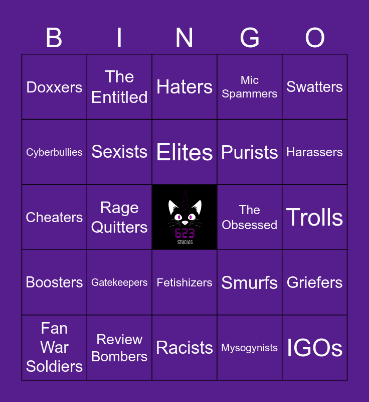 This bingo card has a free space and 24 words: Gatekeepers, Review Bombers, Elites, Fan War Soldiers, Swatters, Doxxers, Cyberbullies, The Entitled, The Obsessed, Fetishizers, Purists, Cheaters, Smurfs, Griefers, Sexists, Mysogynists, Trolls, Haters, Harassers, Rage Quitters, IGOs, Boosters, Mic Spammers and Racists.