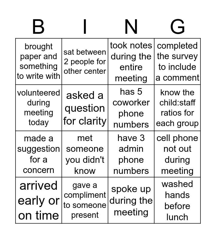 This bingo card has 16 words: gave a compliment to someone present, cell phone not out during meeting, took notes during the entire meeting, brought paper and something to write with, made a suggestion for a concern, sat between 2 people for other center, have 3 admin phone numbers, spoke up during the meeting, volunteered during meeting today, asked a question for clarity, arrived early or on time, completed the survey to include a comment, met someone you didn't know, know the child:staff ratios for each group, has 5 coworker phone numbers and washed hands before lunch.