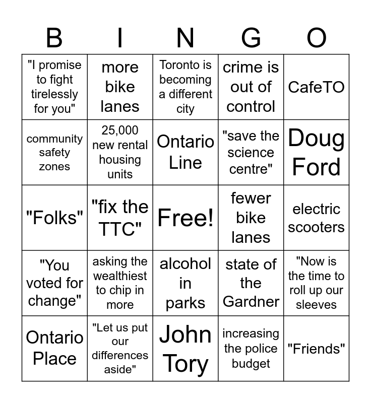 This bingo card has a free space and 24 words: Ontario Place, asking the wealthiest to chip in more, Ontario Line, increasing the police budget, CafeTO, "I promise to fight tirelessly for you", more bike lanes, Toronto is becoming a different city, fewer bike lanes, electric scooters, "Folks", 25,000 new rental housing units, state of the Gardner, "Now is the time to roll up our sleeves, community safety zones, "Let us put our differences aside", John Tory, crime is out of control, Doug Ford, "You voted for change", "fix the TTC", alcohol in parks, "save the science centre" and "Friends".