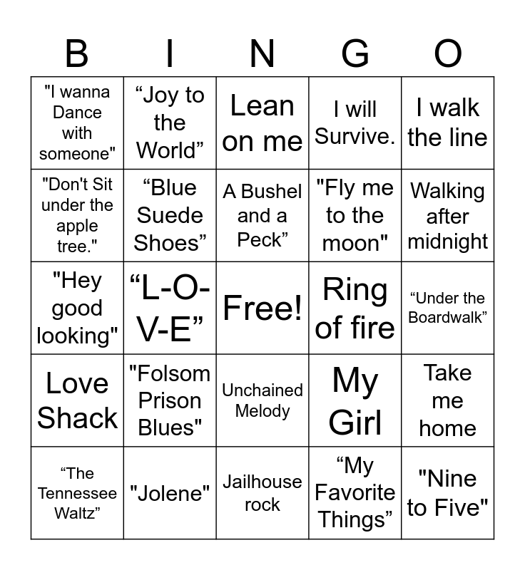 This bingo card has a free space and 24 words: "Folsom Prison Blues", "Jolene", A Bushel and a Peck”, “The Tennessee Waltz”, I walk the line, "I wanna Dance with someone", "Don't Sit under the apple tree.", “Joy to the World”, Ring of fire, Unchained Melody, "Fly me to the moon", "Hey good looking", My Girl, Take me home, “Blue Suede Shoes”, “My Favorite Things”, “Under the Boardwalk”, Lean on me, Walking after midnight, “L-O-V-E”, "Nine to Five", Love Shack, I will Survive. and Jailhouse rock.