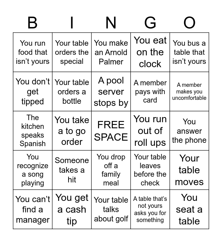 This bingo card has a free space and 24 words: Someone takes a hit, You get a cash tip, A pool server stops by, You can’t find a manager, You bus a table that isn’t yours, You run food that isn’t yours, You don’t get tipped, Your table orders the special, You run out of roll ups, You drop off a family meal, A member pays with card, The kitchen speaks Spanish, Your table leaves before the check, Your table moves, Your table orders a bottle, A table that’s not yours asks you for something, You answer the phone, You make an Arnold Palmer, A member makes you uncomfortable, You take a to go order, You seat a table, You recognize a song playing, You eat on the clock and Your table talks about golf.
