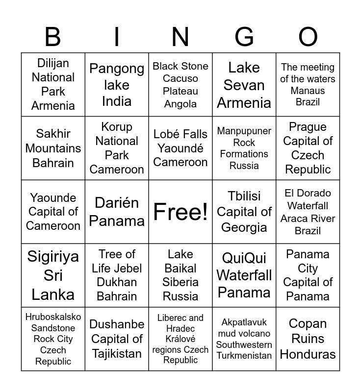 This bingo card has a free space and 79 words: Lunada Captial Of Angola, Kalandula Falls Angola, Black Stone Cacuso Plateau Angola, Miradour A Da Lua Angola, Arch Lagoon Angola, Perito Moreno Glacier Argentina, Buenos Ares Capital Of Argentina, Patagonia Aregentina, Nahuel Huapi National Park Argentina, Talampaya National Park Argentina, Yareven Capital of Aremnia, Mount Aragats Armenia, Lake Sevan Armenia, Dilijan National Park Armenia, Manamon City Capital of Bahrain, Sakhir Mountains Bahrain, Jabal al Dukhan Mountain of Smoke Bahrain, Tree of Life Jebel Dukhan Bahrain, Brasilia Capital of Brazil, El Dorado Waterfall Araca River Brazil, Serra Dos Órgãos Mountain Range Brazil, The meeting of the waters Manaus Brazil, Yaounde Capital of Cameroon, Lobé Falls Yaoundé Cameroon, Korup National Park Cameroon, Rhumsiki Peak Mandara Mountains Cameroon, Santiago Capital of Chile, Torres del Paine Chile, Erratic Rock Chile, Atacama Desert Chile, Prague Capital of Czech Republic, Krkonoše national park, Liberec and Hradec Králové regions Czech Republic, Resov Waterfall Czech Republic, Hruboskalsko Sandstone Rock City Czech Republic, Tbilisi Capital of Georgia, Juta Chaukhi Pass Abudelauri Ladies Georgia, Truso Valley Georgia, Tegucigalpa Capital of Honduras, Copan Ruins Honduras, Pulhapanzak Waterfall Honduras, Pico Bonito National Park Honduras, New Delhi Capital of India, St. Mary’s Island India, Dhuyadhar Falls India, Pangong lake India, Wellington Capital of New Zealand, Milford Sound Fiordland Zealand, Taranaki Maunga New Zealand, Tongariro New Zealand, Panama City Capital of Panama, Darién Panama, QuiQui Waterfall Panama, Volcán Barú Panama, Port Moresby Harbour Capital of Papua New Guinea, Mt Wilhelm Papua New Guinea, Sepik River Papua New Guinea, Wawoi Falls Papua New Guinea, Moscow Capital of Russia, Lake Baikal Siberia Russia, Manpupuner Rock Formations Russia, Mount Elbrus Russia, Belgrade Capital of Serbia, Vratna Gates Serbia, Krupaj Springs Serbia, Uvac River Serbia, Sri Jayawardenepura Kotte Capital of Sri Lanka, Colombo commercial center Sri Lanka, St Clair's falls Sri Lanka, Sigiriya Sri Lanka, Dushanbe Capital of Tajikistan, Fann Mountains Tajikistan, Tajik National Park Tajikistan, Lake Iskanderkul Tajikistan, Ashgabat Capital of Turkmenistan, Akpatlavuk mud volcano Southwestern Turkmenistan, Garabogazköl Basin Turkmenistan, Yangkala Canyon Balkan Turkmenistan and Oldest National Parks in the United States.