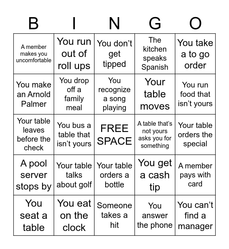 This bingo card has a free space and 24 words: Your table talks about golf, You eat on the clock, You recognize a song playing, You seat a table, You take a to go order, A member makes you uncomfortable, You make an Arnold Palmer, You run out of roll ups, A table that’s not yours asks you for something, Your table orders a bottle, Your table moves, Your table leaves before the check, You get a cash tip, A member pays with card, You drop off a family meal, You answer the phone, Your table orders the special, You don’t get tipped, You run food that isn’t yours, You bus a table that isn’t yours, You can’t find a manager, A pool server stops by, The kitchen speaks Spanish and Someone takes a hit.
