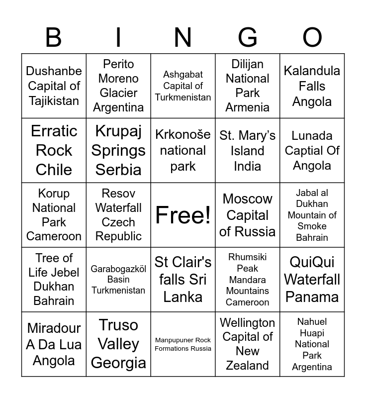 This bingo card has a free space and 79 words: Akpatlavuk mud volcano Southwestern Turkmenistan, Arch Lagoon Angola, Ashgabat Capital of Turkmenistan, Atacama Desert Chile, Belgrade Capital of Serbia, Black Stone Cacuso Plateau Angola, Brasilia Capital of Brazil, Buenos Ares Capital Of Argentina, Colombo commercial center Sri Lanka, Copan Ruins Honduras, Darién Panama, Dhuyadhar Falls India, Dilijan National Park Armenia, Dushanbe Capital of Tajikistan, El Dorado Waterfall Araca River Brazil, Erratic Rock Chile, Fann Mountains Tajikistan, Garabogazköl Basin Turkmenistan, Hruboskalsko Sandstone Rock City Czech Republic, Jabal al Dukhan Mountain of Smoke Bahrain, Juta Chaukhi Pass Abudelauri Ladies Georgia, Kalandula Falls Angola, Korup National Park Cameroon, Krkonoše national park, Krupaj Springs Serbia, Lake Baikal Siberia Russia, Lake Iskanderkul Tajikistan, Lake Sevan Armenia, Liberec and Hradec Králové regions Czech Republic, Lobé Falls Yaoundé Cameroon, Lunada Captial Of Angola, Manamon City Capital of Bahrain, Manpupuner Rock Formations Russia, Milford Sound Fiordland Zealand, Miradour A Da Lua Angola, Moscow Capital of Russia, Mount Aragats Armenia, Mount Elbrus Russia, Mt Wilhelm Papua New Guinea, Nahuel Huapi National Park Argentina, New Delhi Capital of India, Oldest National Parks in the United States, Panama City Capital of Panama, Pangong lake India, Patagonia Aregentina, Perito Moreno Glacier Argentina, Pico Bonito National Park Honduras, Port Moresby Harbour Capital of Papua New Guinea, Prague Capital of Czech Republic, Pulhapanzak Waterfall Honduras, QuiQui Waterfall Panama, Resov Waterfall Czech Republic, Rhumsiki Peak Mandara Mountains Cameroon, Sakhir Mountains Bahrain, Santiago Capital of Chile, Sepik River Papua New Guinea, Serra Dos Órgãos Mountain Range Brazil, Sigiriya Sri Lanka, Sri Jayawardenepura Kotte Capital of Sri Lanka, St Clair's falls Sri Lanka, St. Mary’s Island India, Tajik National Park Tajikistan, Talampaya National Park Argentina, Taranaki Maunga New Zealand, Tbilisi Capital of Georgia, Tegucigalpa Capital of Honduras, The meeting of the waters Manaus Brazil, Tongariro New Zealand, Torres del Paine Chile, Tree of Life Jebel Dukhan Bahrain, Truso Valley Georgia, Uvac River Serbia, Volcán Barú Panama, Vratna Gates Serbia, Wawoi Falls Papua New Guinea, Wellington Capital of New Zealand, Yangkala Canyon Balkan Turkmenistan, Yaounde Capital of Cameroon and Yareven Capital of Aremnia.