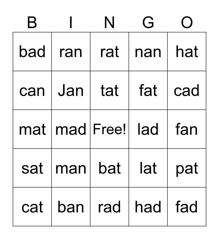 This bingo card has a free space and 29 words: cat, Dan, mad, pan, bad, rat, Jan, man, lad, ban, fan, fad, rad, had, cad, Chad, bat, sat, hat, mat, lat, chat, fat, can, nan, ran, pat, tat and tan.