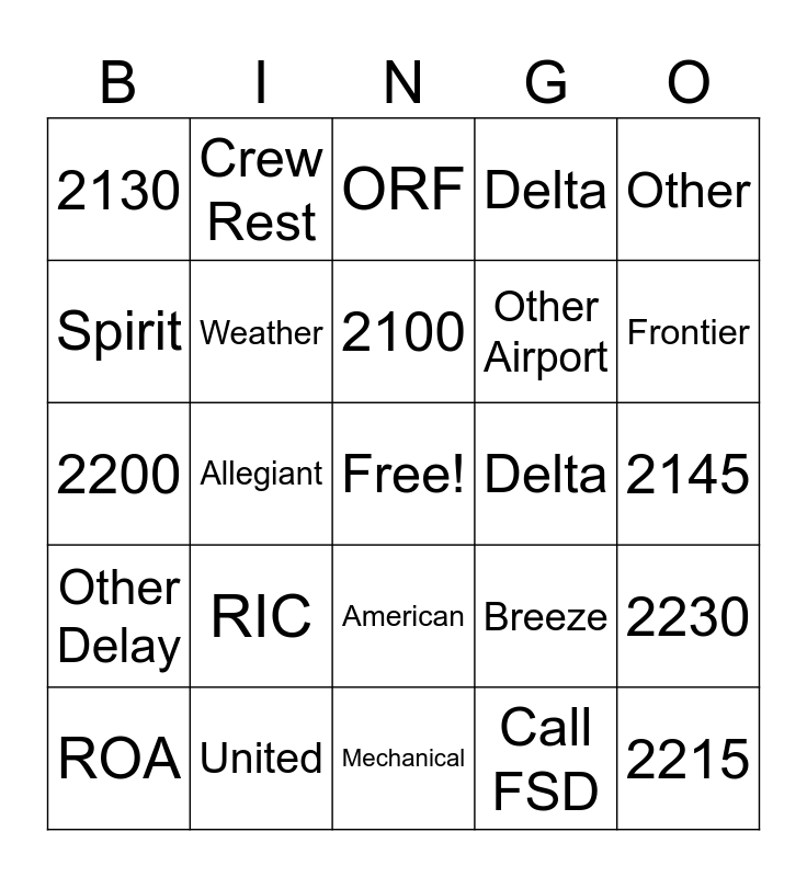 This bingo card has a free space and 24 words: RIC, United, 2100, ROA, Other, 2130, Spirit, Crew Rest, Delta, American, Other Airport, 2200, Breeze, 2230, Weather, Call FSD, 2145, ORF, Frontier, Allegiant, 2215, Other Delay, Delta and Mechanical.