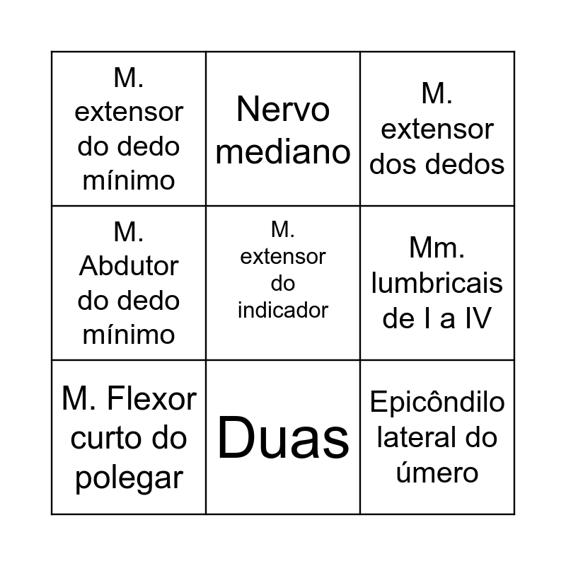 This bingo card has 21 words: M. Adutor do polegar, M. Palmar curto, Nervo mediano, M. Opositor do polegar, M. Abdutor curto do polegar, M. Flexor curto do polegar, M. extensor do dedo mínimo, M. extensor dos dedos, N. ulnar, Duas, Epicôndilo lateral do úmero, M. Abdutor do dedo mínimo, M. flexor curto do dedo mínimo, Articulação metacarpofalângica do dedo mínimo, Mm. lumbricais de I a IV, Mm. interósseos dorsais de I a IV, M. Supinador, Base do metacarpal I, M. extensor do indicador, Compartimento posterior do antebraço and M. extensor longo do polegar.