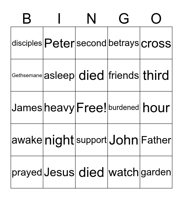 This bingo card has a free space and 24 words: night, Jesus, died, prayed, cross, disciples, Gethsemane, Peter, burdened, support, friends, James, John, Father, asleep, watch, hour, second, third, heavy, garden, awake, betrays and died.