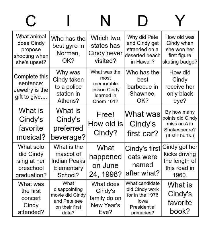 This bingo card has a free space and 24 words: What is the mascot of Indian Peaks Elementary School?, What disappointing movie did Cindy and Pete see on their first date?, What was the most memorable lesson Cindy learned in Chem 101?, What was the first concert Cindy attended?, How old was Cindy when she won her first figure skating badge?, What animal does Cindy propose shooting when she's upset?, Complete this sentence: Jewelry is the gift to give...., Who has the best gyro in Norman, OK?, What was Cindy's first car?, What happened on June 24, 1998?, Who has the best barbecue in Shawnee, OK?, What is Cindy's favorite musical?, Cindy's first cats were named after what?, Cindy got her kicks driving the length of this road in 1960., Why was Cindy taken to a police station in Athens?, What candidate did Cindy work for in the 1976 Iowa Presidential primaries?, By how many points did Cindy miss an A in Shakespeare? (It still hurts.), Which two states has Cindy never visited?, How did Cindy receive her only black eye?, What is Cindy's preferred beverage?, What is Cindy's favorite book?, What solo did Cindy sing at her preschool graduation?, Why did Pete and Cindy get stranded on a deserted beach in Hawaii? and What does Cindy's family do on New Year's Eve?.