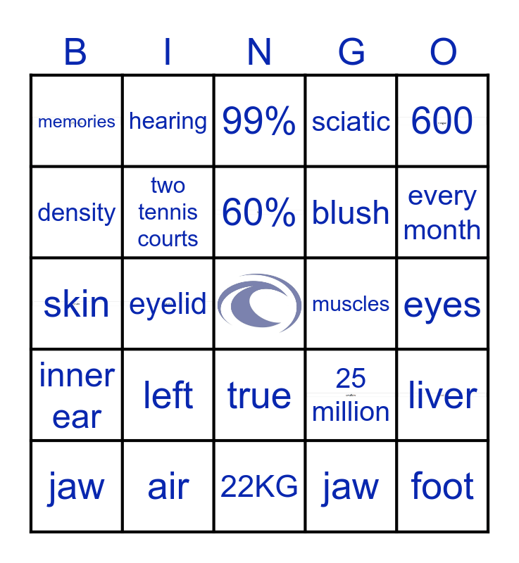 This bingo card has 7 images, a free space and 24 words: left, air, 60%, jaw, 600, memories, density, hearing, muscles, true, blush, skin, 25 million, liver, two tennis courts, jaw, eyes, 99%, every month, eyelid, foot, inner ear, sciatic and 22KG.