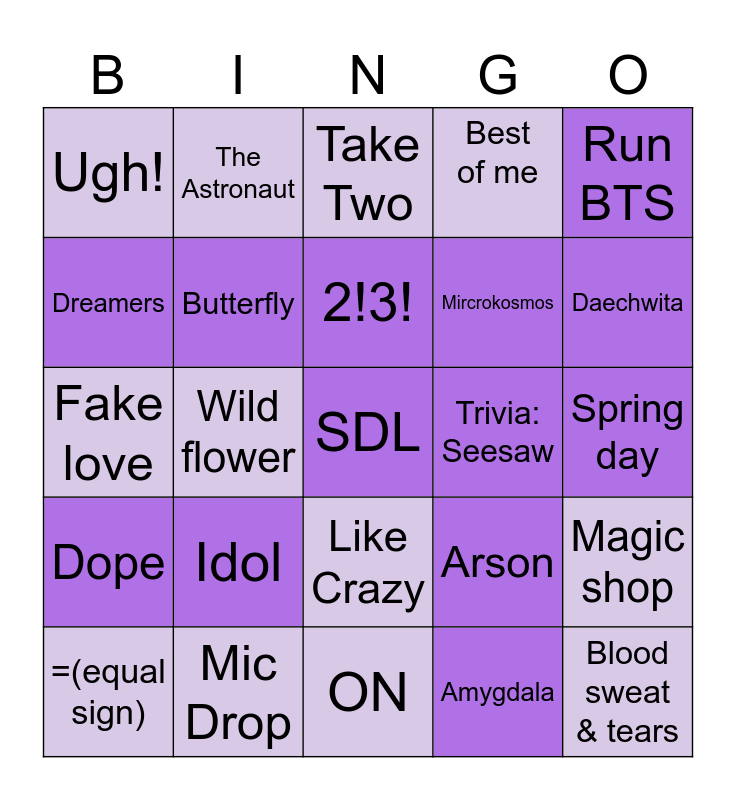 This bingo card has 25 words: Idol, ON, 2!3!, =(equal sign), Run BTS, Ugh!, Dreamers, The Astronaut, Trivia: Seesaw, Like Crazy, Mircrokosmos, Fake love, Arson, Magic shop, Butterfly, Blood sweat & tears, Spring day, Take Two, Daechwita, Wild flower, SDL, Mic Drop, Dope, Best of me and Amygdala.