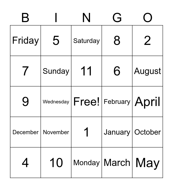 This bingo card has a free space and 31 words: Monday, Tuesday, Wednesday, Thursday, Friday, Saturday, Sunday, January, February, March, April, May, June, July, August, September, October, November, December, 1, 2, 3, 4, 5, 6, 7, 8, 9, 10, 11 and 12.