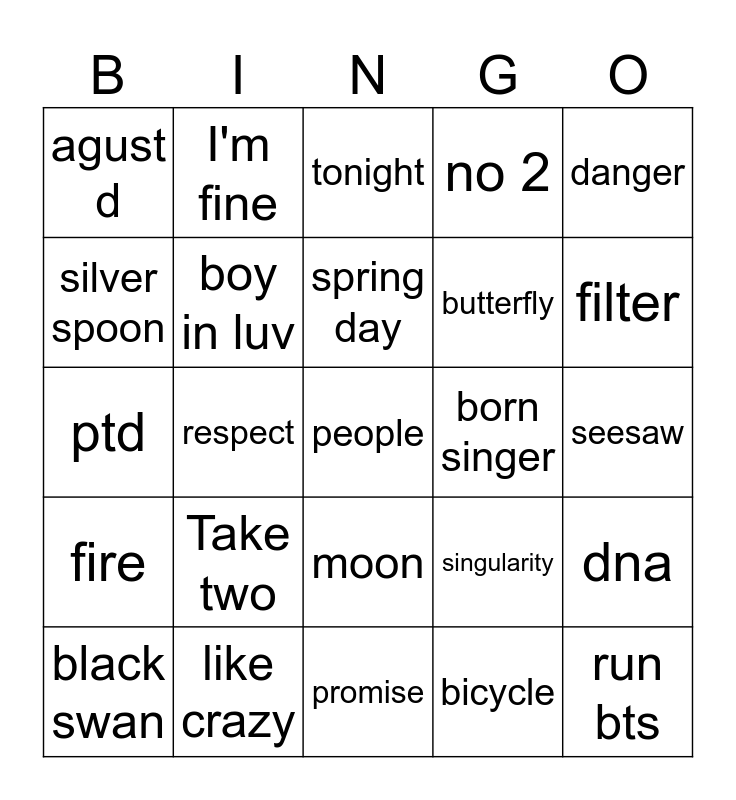 This bingo card has a free space and 24 words: Take two, like crazy, spring day, black swan, danger, agust d, silver spoon, I'm fine, born singer, moon, butterfly, ptd, singularity, dna, boy in luv, bicycle, seesaw, tonight, filter, respect, run bts, fire, no 2 and promise.