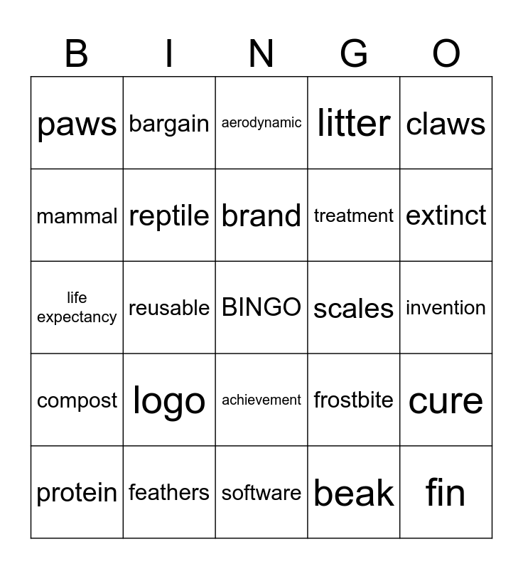 This bingo card has a free space and 24 words: logo, feathers, brand, protein, claws, paws, mammal, bargain, scales, achievement, treatment, life expectancy, frostbite, cure, reptile, beak, invention, aerodynamic, extinct, reusable, fin, compost, litter and software.