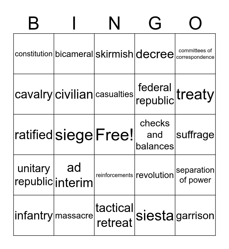 This bingo card has a free space and 24 words: ad interim, massacre, casualties, infantry, committees of correspondence, constitution, cavalry, bicameral, checks and balances, reinforcements, federal republic, ratified, revolution, separation of power, civilian, siesta, suffrage, skirmish, treaty, siege, garrison, unitary republic, decree and tactical retreat.