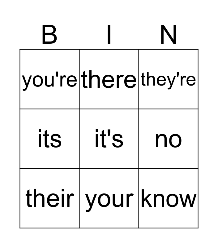 This bingo card has 9 words: their, they're, there, its, you're, no, it's, know and your.