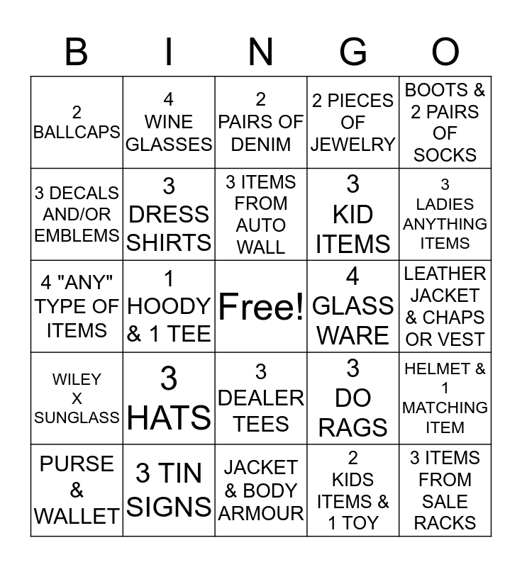 This bingo card has a free space and 24 words: 3 HATS, 3 TIN SIGNS, 3 ITEMS FROM AUTO WALL, PURSE & WALLET, BOOTS & 2 PAIRS OF SOCKS, 2 BALLCAPS, 3 DECALS AND/OR EMBLEMS, 4 WINE GLASSES, 4 GLASS WARE, 3 DEALER TEES, 3 KID ITEMS, 4 "ANY" TYPE OF ITEMS, 3 DO RAGS, HELMET & 1 MATCHING ITEM, 3 DRESS SHIRTS, 2 KIDS ITEMS & 1 TOY, LEATHER JACKET & CHAPS OR VEST, 2 PAIRS OF DENIM, 3 LADIES ANYTHING ITEMS, 1 HOODY & 1 TEE, 3 ITEMS FROM SALE RACKS, WILEY X SUNGLASS, 2 PIECES OF JEWELRY and JACKET & BODY ARMOUR.