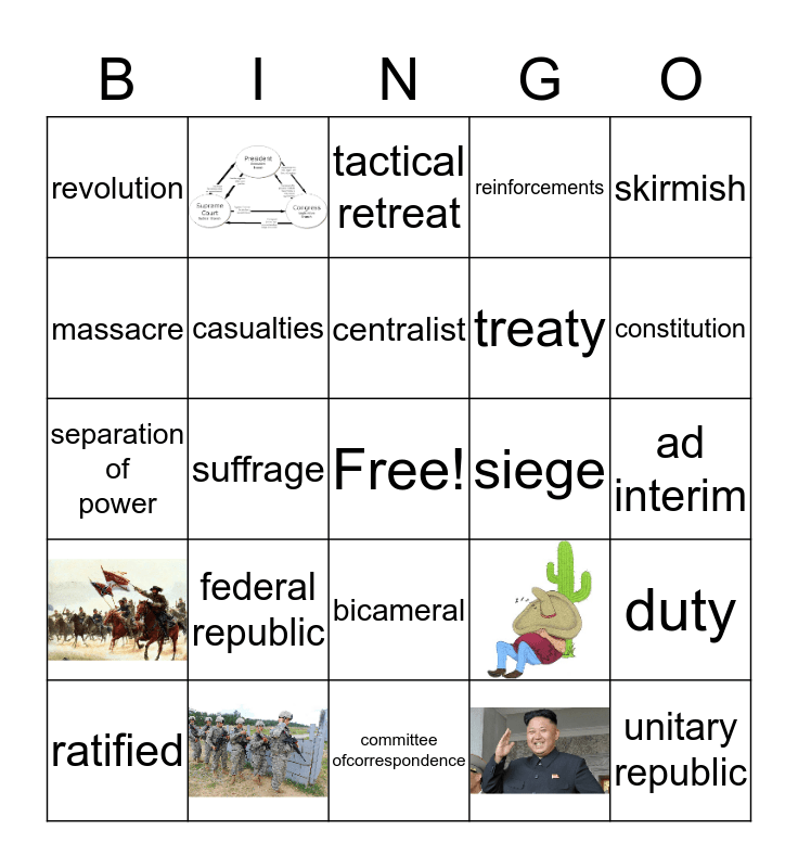 This bingo card has 5 images, a free space and 19 words: federal republic, centralist, ratified, skirmish, revolution, massacre, siege, bicameral, treaty, separation of power, duty, casualties, ad interim, tactical retreat, constitution, suffrage, unitary republic, reinforcements and committee ofcorrespondence.
