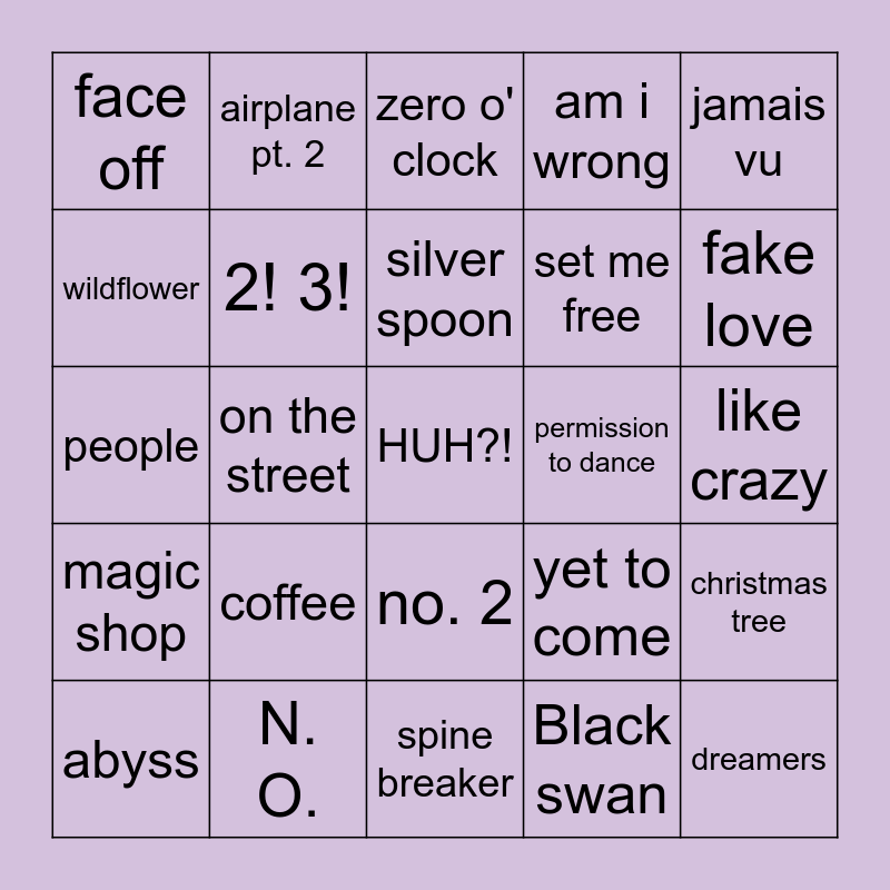 This bingo card has 25 words: coffee, spine breaker, silver spoon, abyss, jamais vu, face off, wildflower, airplane pt. 2, permission to dance, no. 2, set me free, people, yet to come, christmas tree, 2! 3!, dreamers, like crazy, zero o' clock, fake love, on the street, HUH?!, N. O., magic shop, am i wrong and Black swan.