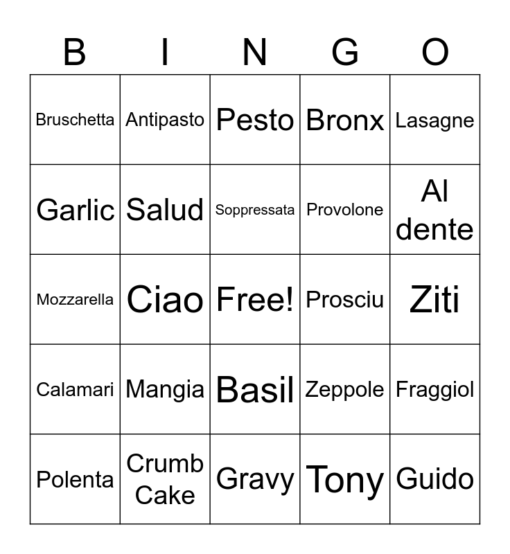 This bingo card has a free space and 44 words: Pasta, Guido, Josephine, Polenta, Italy, Tony, Pesto, Lemon Meringue, Lasagne, Crumb Cake, Bronx, Prosciu, Basil, Mangia, Naples, Gravy, Ricotta, Mozzarella, Pizza, Al dente, Antipasto, Cannoli, Spaghetti, Bruschetta, Artichoke, Ziti, Arugula, Sfogliatelle, Zeppole, Calamari, Capeesh, Fraggiol, Frittata, Goomba, Ciao, Struffoli, Manicotti, Maronna Mia, Soppressata, Garlic, Provolone, Sambuca, Salud and Stunad.