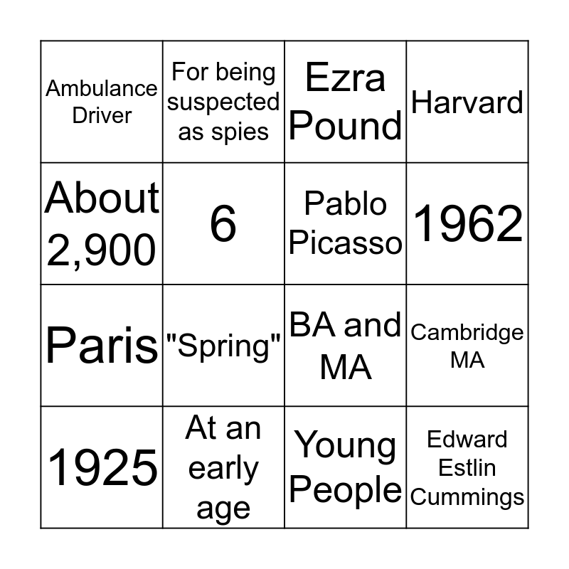 This bingo card has a free space and 15 words: 1925, Edward Estlin Cummings, Ezra Pound, Ambulance Driver, 1962, About 2,900, "Spring", Young People, 6, Paris, Cambridge MA, Harvard, Pablo Picasso, For being suspected as spies and At an early age.