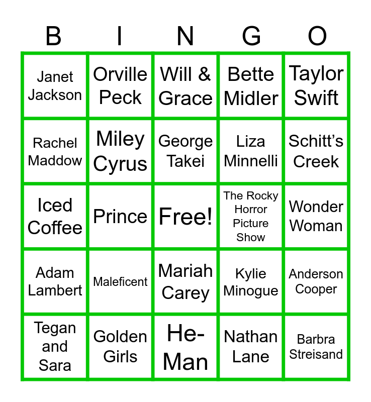 This bingo card has a free space and 33 words: Madonna, David Bowie, Prince, George Michael, Adam Lambert, Miley Cyrus, Taylor Swift, Tegan and Sara, Orville Peck, Velma Dinkley, George Takei, Will & Grace, The Birdcage, Moonlight, The Rocky Horror Picture Show, Schitt’s Creek, Golden Girls, Iced Coffee, Maleficent, Kylie Minogue, Mariah Carey, Judy Garland, Janet Jackson, Wonder Woman, He-Man, Barbra Streisand, Bette Midler, Liza Minnelli, Rachel Maddow, Anderson Cooper, Rosie O’Donnell, Nathan Lane and Chaz Bono.