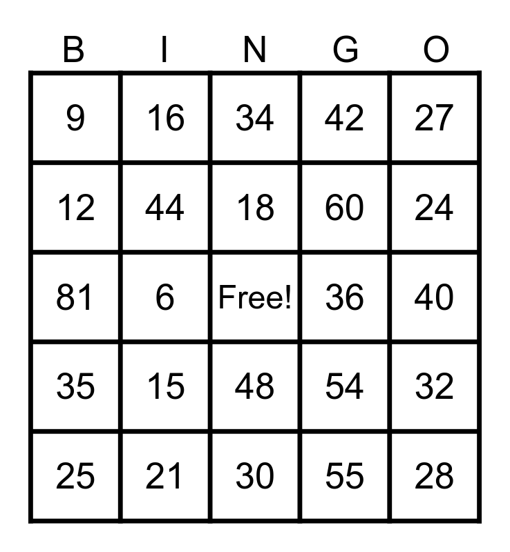 This bingo card has a free space and 24 words: 15, 21, 18, 25, 27, 9, 12, 16, 36, 48, 60, 81, 54, 32, 44, 55, 40, 34, 24, 6, 28, 35, 42 and 30.