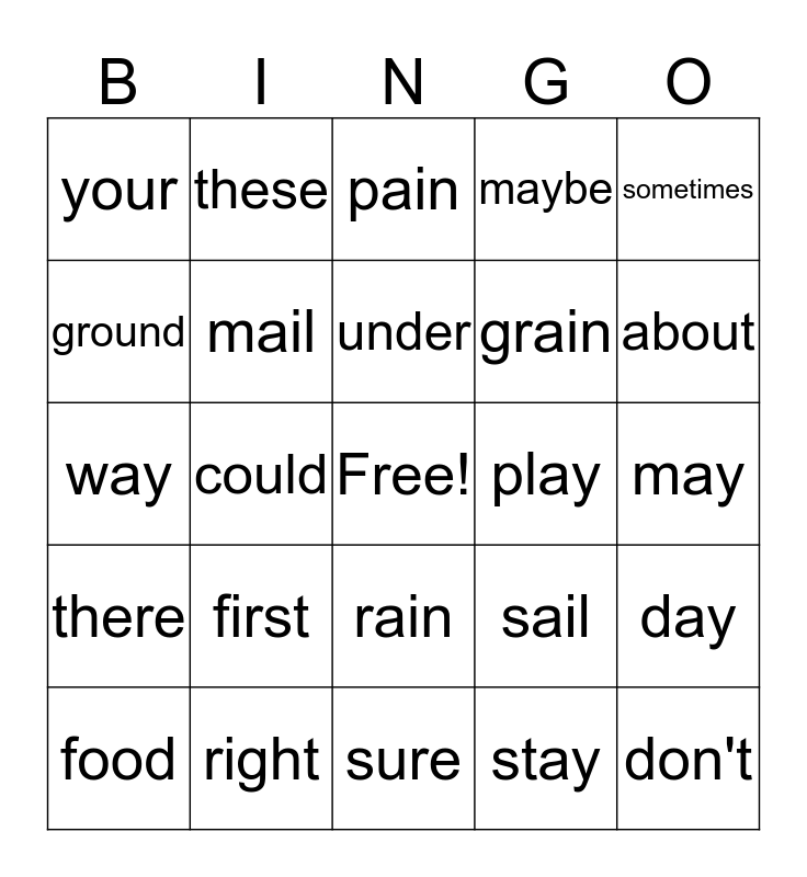 This bingo card has a free space and 24 words: first, right, under, food, sometimes, your, ground, these, play, rain, grain, way, sail, day, mail, stay, may, pain, about, could, don't, there, maybe and sure.