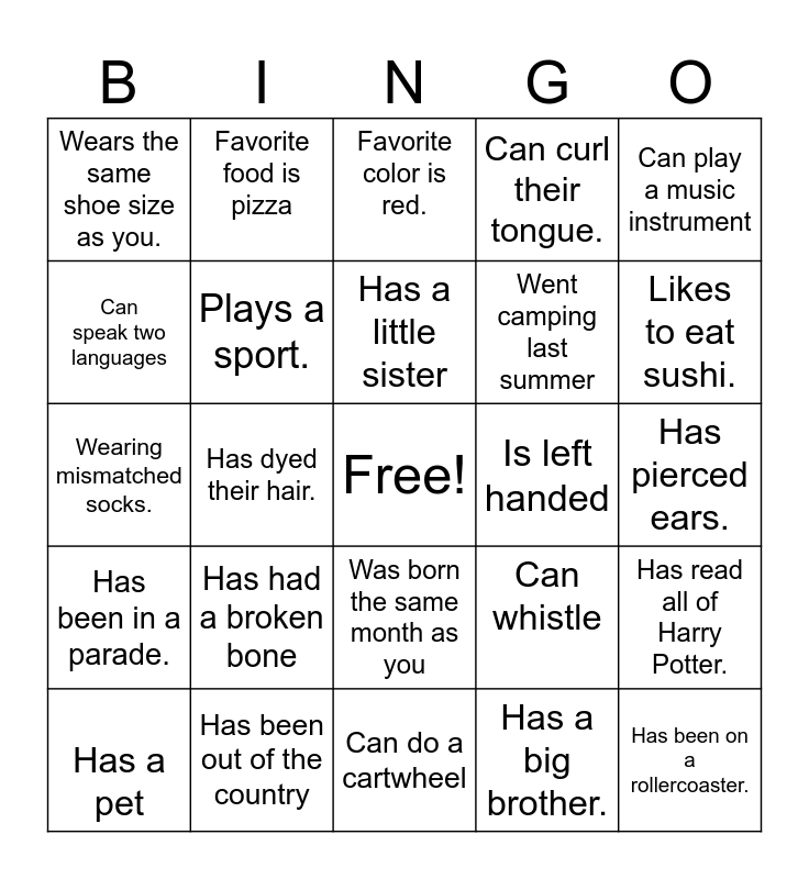 This bingo card has a free space and 24 words: Has had a broken bone, Has been out of the country, Has a little sister, Has a pet, Can play a music instrument, Wears the same shoe size as you., Can speak two languages, Favorite food is pizza, Is left handed, Was born the same month as you, Went camping last summer, Wearing mismatched socks., Can whistle, Has read all of Harry Potter., Plays a sport., Has a big brother., Has pierced ears., Favorite color is red., Likes to eat sushi., Has dyed their hair., Has been on a rollercoaster., Has been in a parade., Can curl their tongue. and Can do a cartwheel.