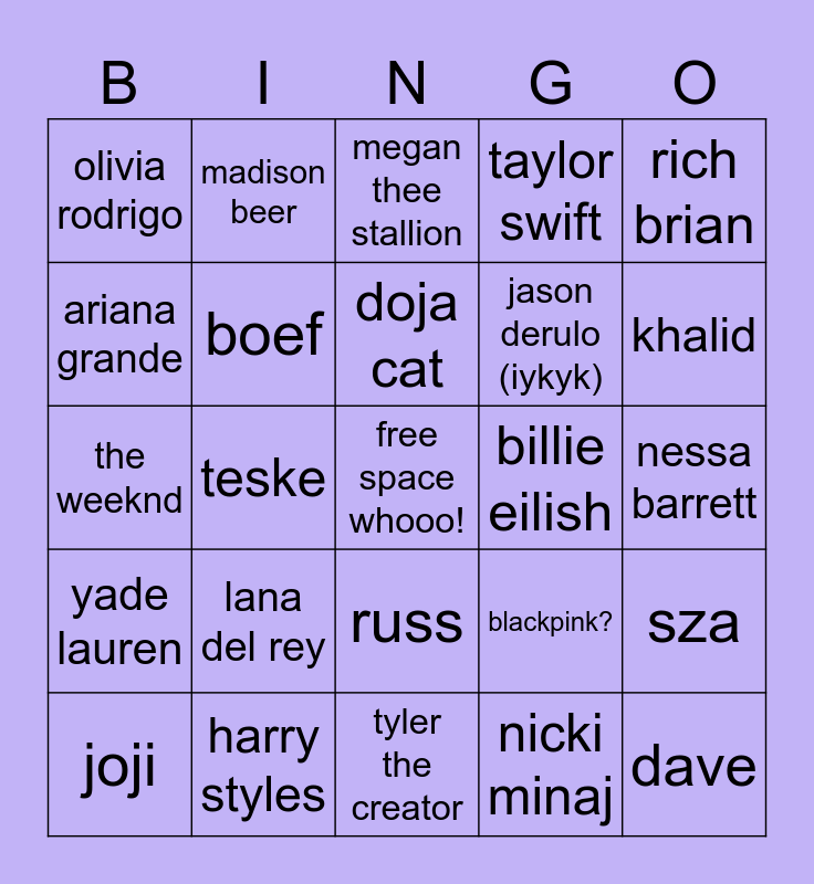 This bingo card has a free space and 24 words: lana del rey, harry styles, doja cat, joji, rich brian, olivia rodrigo, ariana grande, madison beer, billie eilish, russ, jason derulo (iykyk), the weeknd, blackpink?, sza, boef, nicki minaj, nessa barrett, megan thee stallion, khalid, teske, dave, yade lauren, taylor swift and tyler the creator.