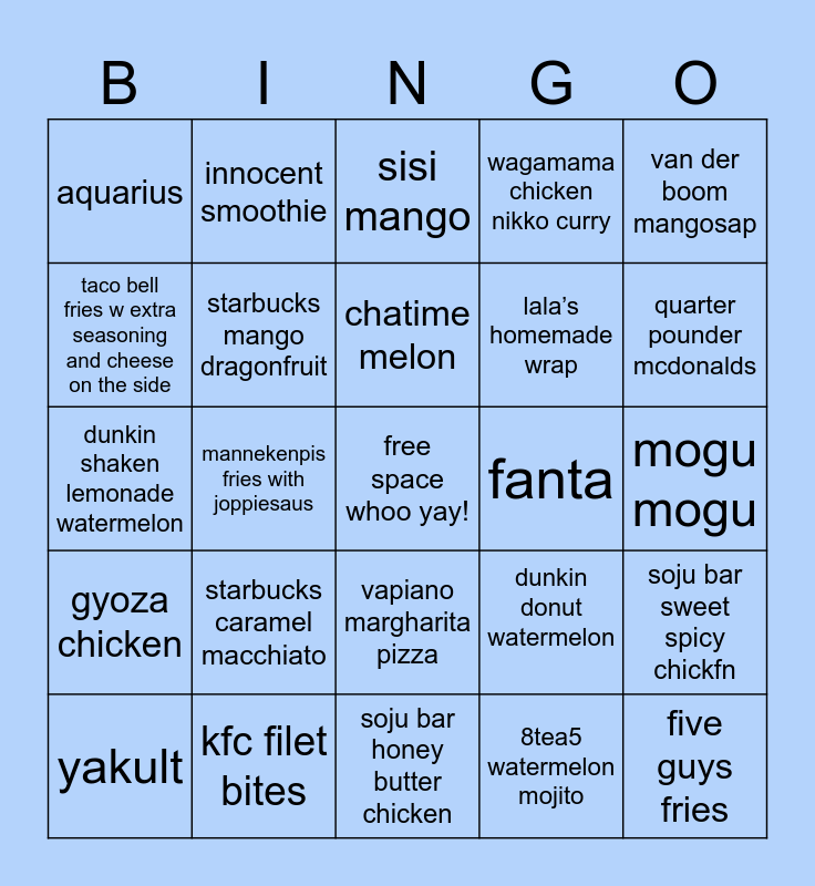 This bingo card has a free space and 24 words: yakult, starbucks caramel macchiato, chatime melon, 8tea5 watermelon mojito, van der boom mangosap, aquarius, innocent smoothie, sisi mango, fanta, mogu mogu, dunkin shaken lemonade watermelon, starbucks mango dragonfruit, dunkin donut watermelon, soju bar sweet spicy chickfn, taco bell fries w extra seasoning and cheese on the side, kfc filet bites, soju bar honey butter chicken, wagamama chicken nikko curry, quarter pounder mcdonalds, gyoza chicken, mannekenpis fries with joppiesaus, vapiano margharita pizza, lala’s homemade wrap and five guys fries.