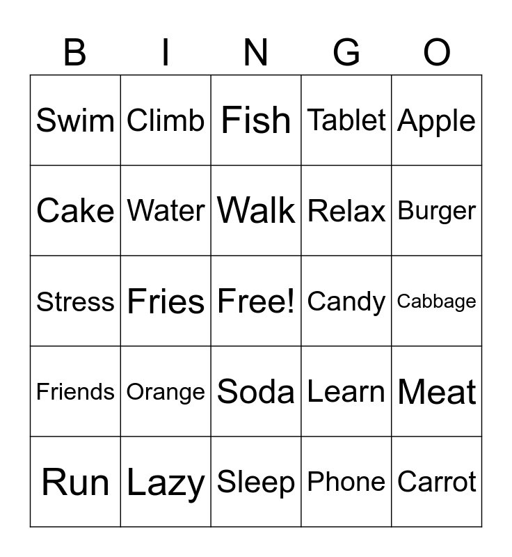This bingo card has a free space and 25 words: Orange, Sleep, Walk, Run, Apple, Swim, Cake, Climb, Candy, Soda, Relax, Stress, Learn, Meat, Water, Pizza, Cabbage, Fish, Burger, Fries, Carrot, Lazy, Friends, Tablet and Phone.