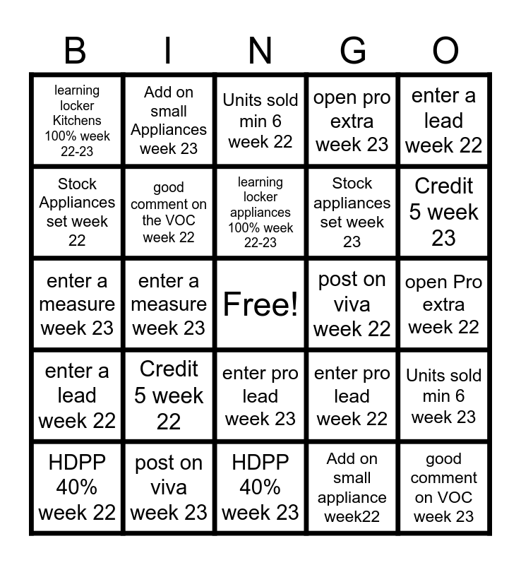 This bingo card has a free space and 24 words: HDPP 40% week 22, Credit 5 week 22, learning locker appliances 100% week 22-23, Add on small appliance week22, enter a lead week 22, learning locker Kitchens 100% week 22-23, Add on small Appliances week 23, Units sold min 6 week 22, post on viva week 22, open Pro extra week 22, enter a measure week 23, good comment on the VOC week 22, enter pro lead week 22, Units sold min 6 week 23, Stock Appliances set week 22, post on viva week 23, HDPP 40% week 23, open pro extra week 23, Credit 5 week 23, enter a lead week 22, enter a measure week 23, enter pro lead week 23, Stock appliances set week 23 and good comment on VOC week 23.