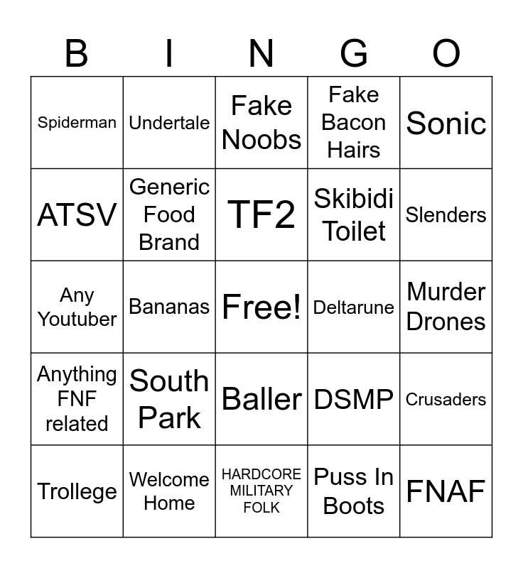 This bingo card has a free space and 24 words: South Park, Welcome Home, TF2, Trollege, Sonic, Spiderman, ATSV, Undertale, Deltarune, Baller, Skibidi Toilet, Any Youtuber, DSMP, Crusaders, Generic Food Brand, Puss In Boots, Murder Drones, Fake Noobs, Slenders, Bananas, FNAF, Anything FNF related, Fake Bacon Hairs and HARDCORE MILITARY FOLK.